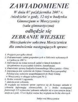 ZAWIADOMIENIEW dniu 07 października 2007 r. /niedziela/ o godz. 12-tej w budynku Gimnazjum w Moszczenicy (sala gimnastyczna) odbędzie się ZEBRANIE WIEJSKIE Mieszkańców sołectwa Moszczenica dla omówienia następujących spraw:1. Przyjęcie porządku obrad.2. Podsumowanie zadań gospodarczych w Sołectwie wykonanych w I półroczu 2007 r.3. In...